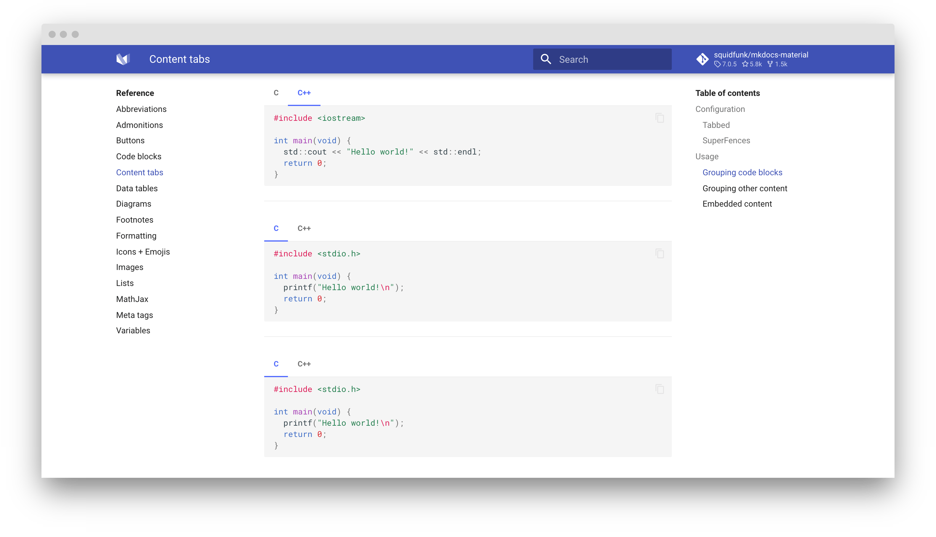 Sometimes, it's desirable to group alternative content under different tabs, e.g. when describing how to access an API from different languages or environments. Material for MkDocs allows for beautiful and functional tabs, grouping code blocks and other content.