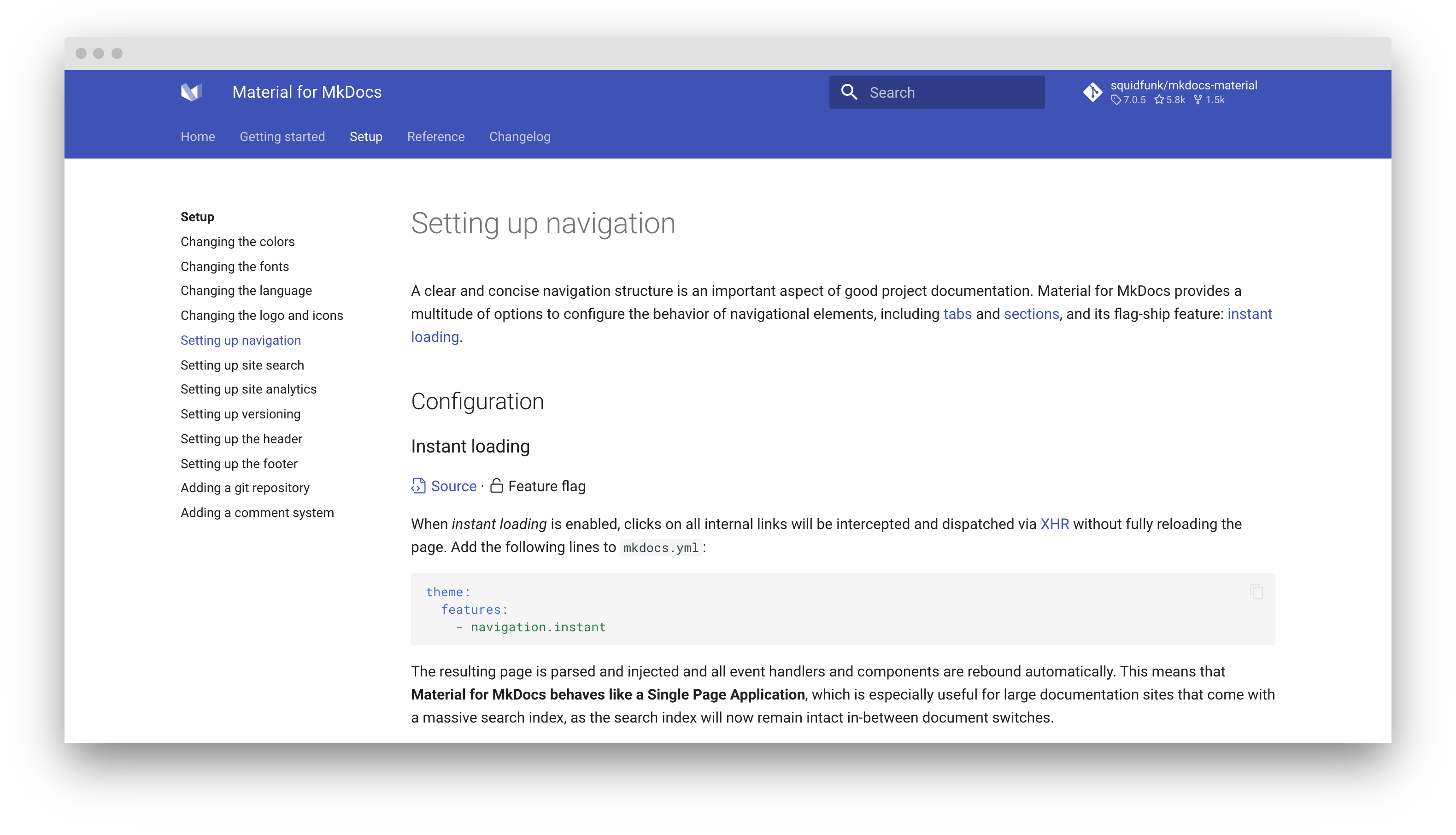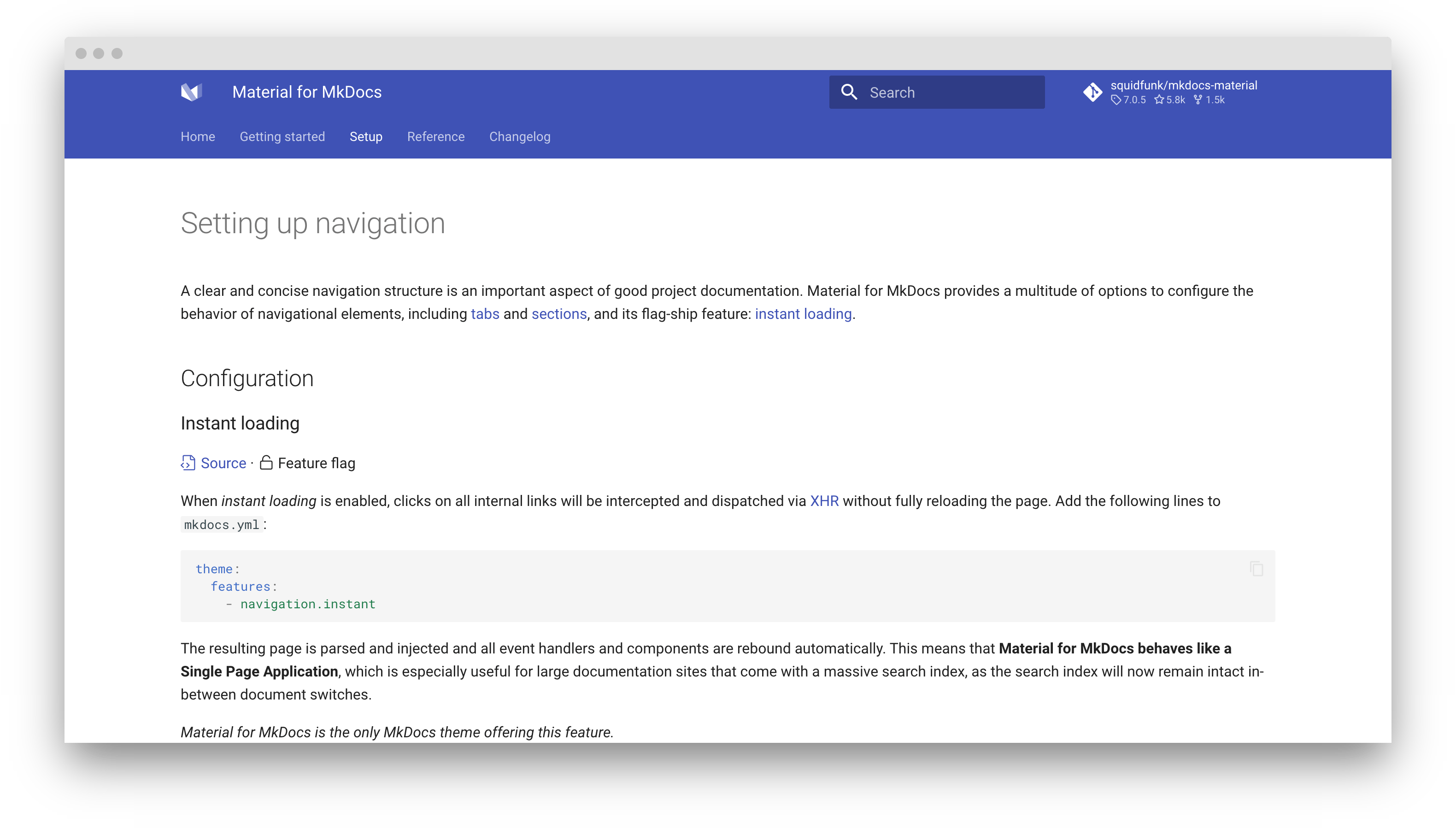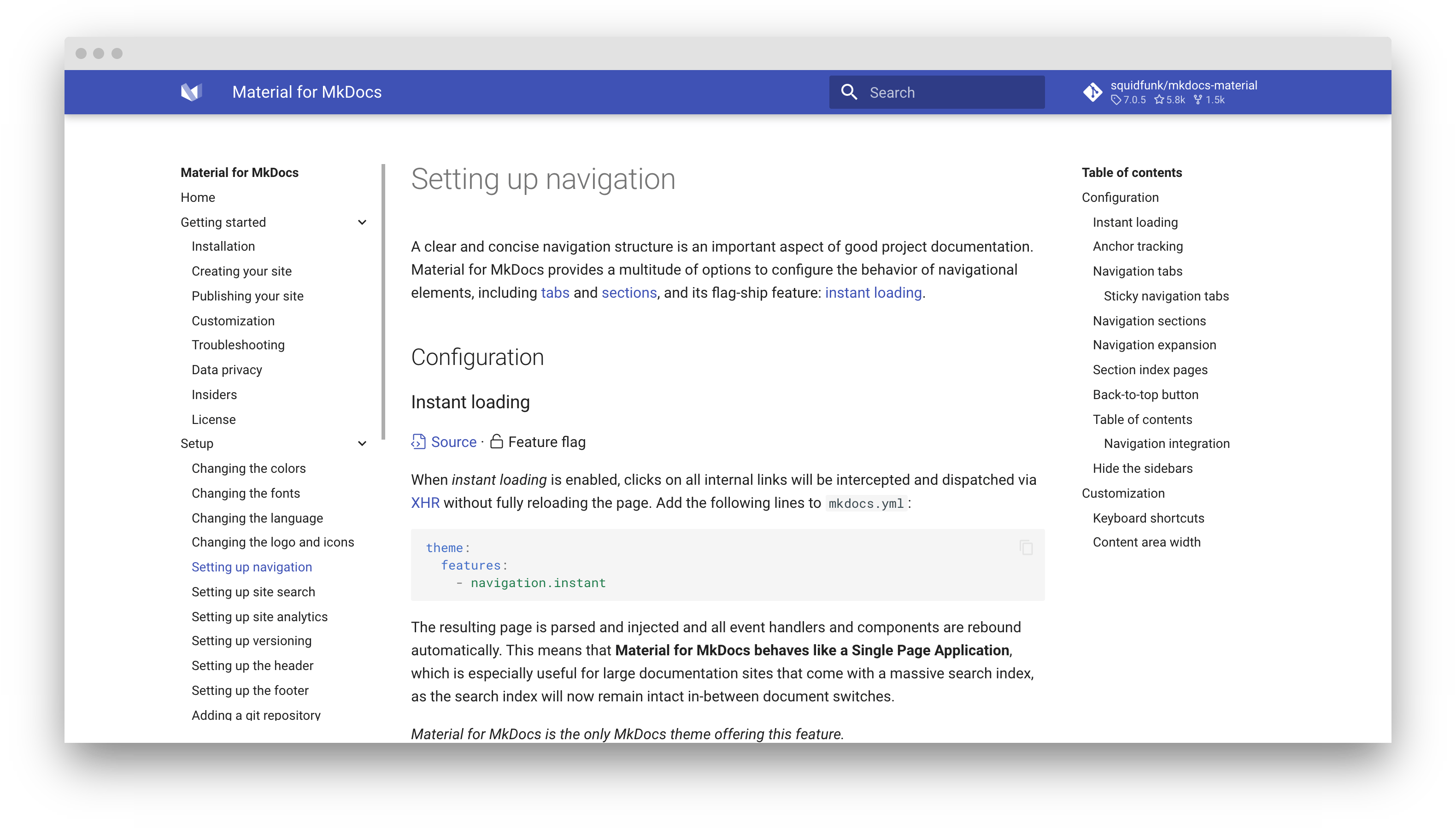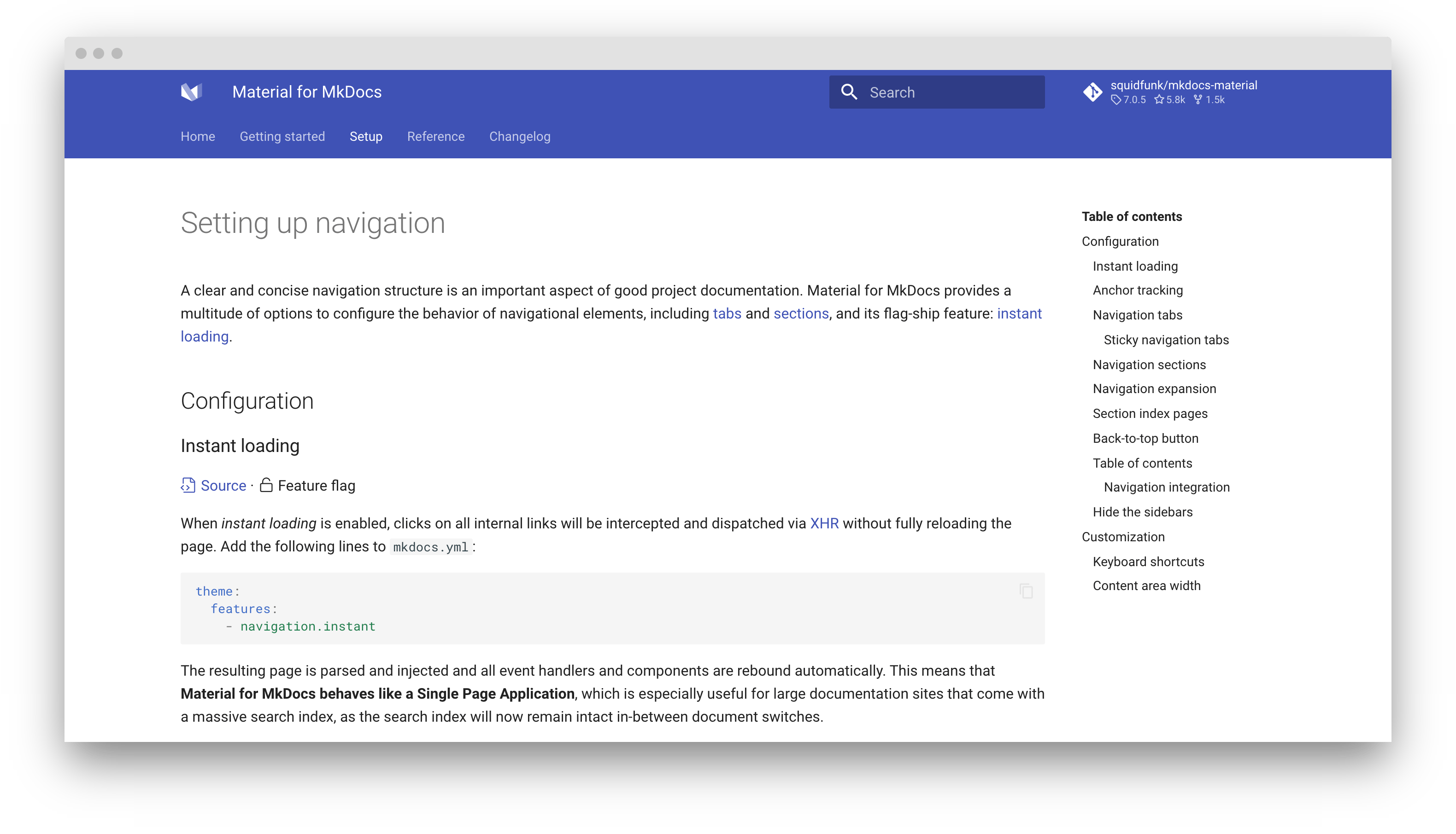 A clear and concise navigation structure is an important aspect of good project documentation. Material for MkDocs provides a multitude of options to configure the behavior of navigational elements, including tabs and sections, and one of its flagship features: instant loading.